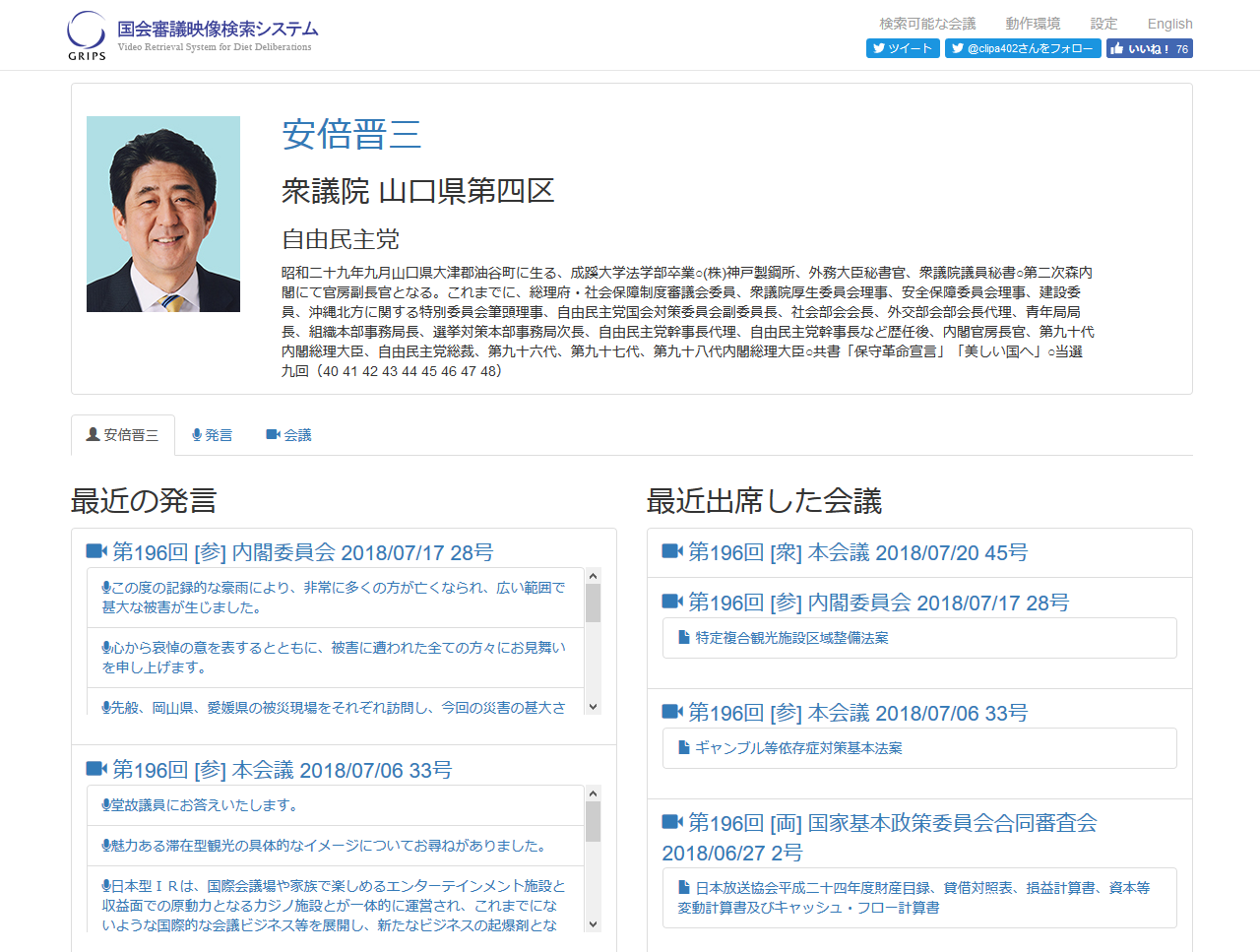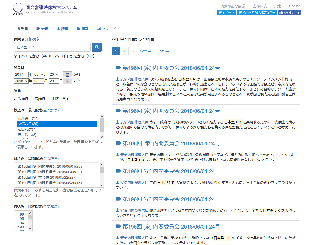 「国会審議映像検索システムとそのSNS的活用の可能性:ニュースと審議映像のTweet」2017. GRIPS Discussion Papers. 17-12.